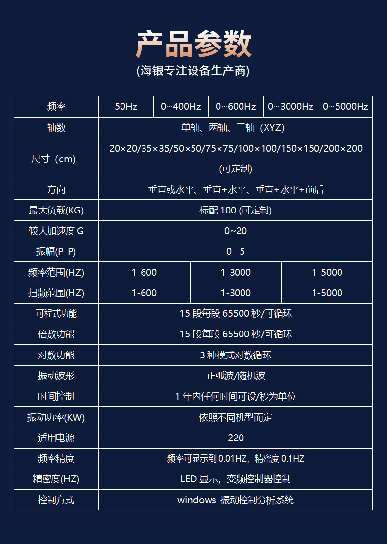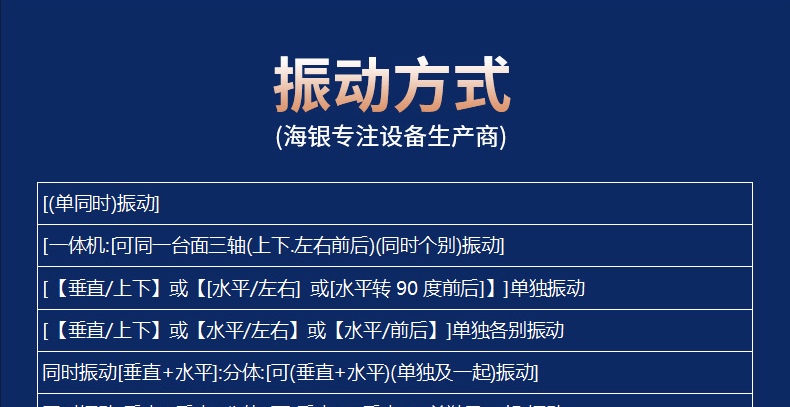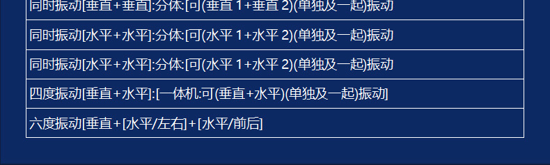 NO | L型 | 型號 | 振動方式/頻率Hz | 方向[分體] | 控制模式[分體] | 尺寸CM | 總高cm | 承重kg | 振幅mm | 加速度 | 時間/秒 | |